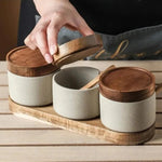 Enhance your kitchen with this beautifully crafted ceramic seasoning jar set. Designed with a sleek round shape and natural wooden lids, it combines contemporary elegance with practical use, making it perfect for storing spices, sugar, salt, and more.