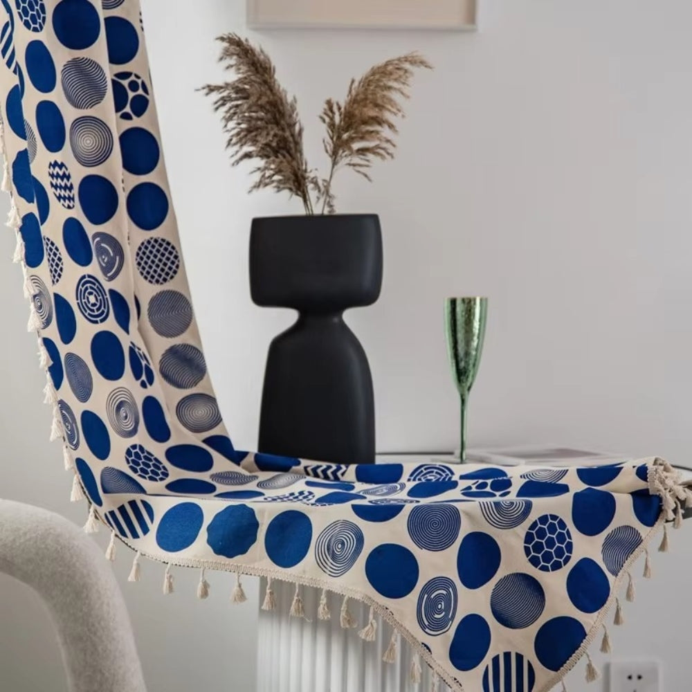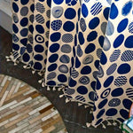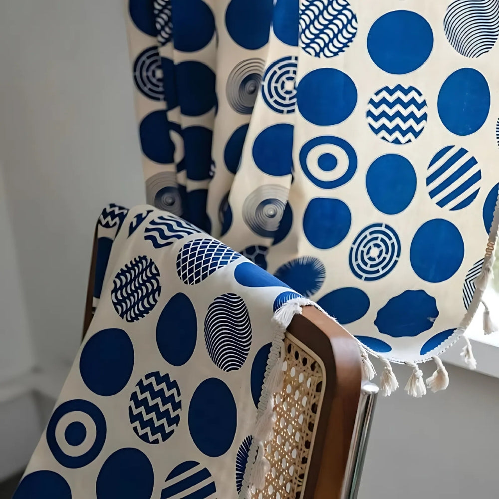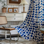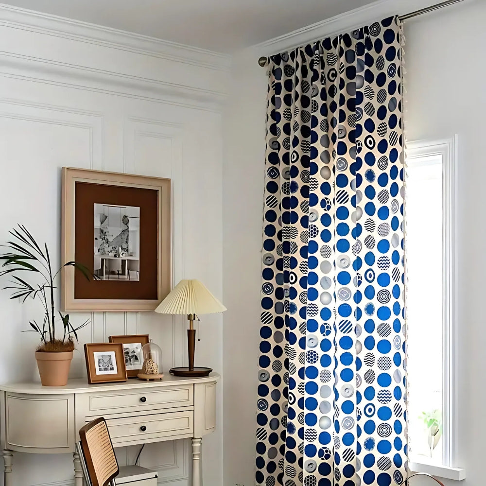 Add a pop of personality to your windows with this retro-inspired curtain, featuring bold blue polka dots and intricate patterns.
